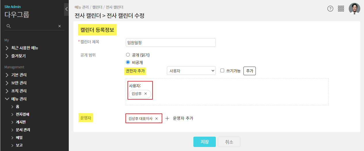 ① 관리자페이지(SiteAdmin) ▶ 메뉴 관리 ▶ 캘린더 ▶ 전사 캘린더 ▶ 설정