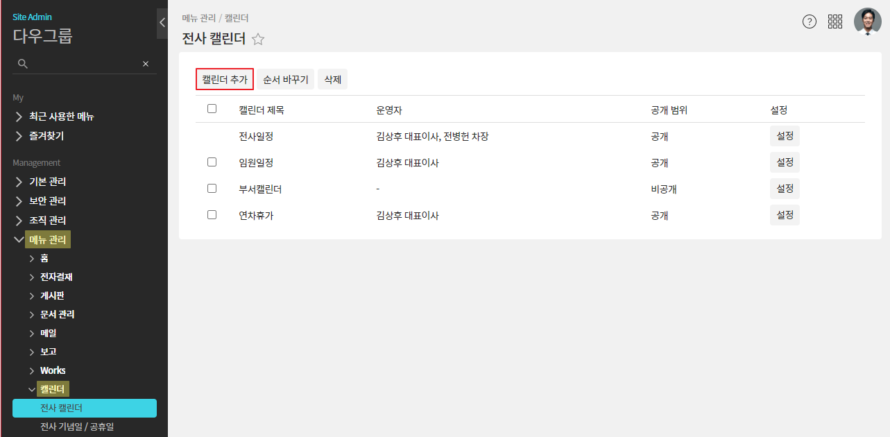 ① 관리자페이지(SiteAdmin) ▶ 메뉴 관리 ▶ 캘린더 ▶ 전사 캘린더 ▶ 캘린더 추가