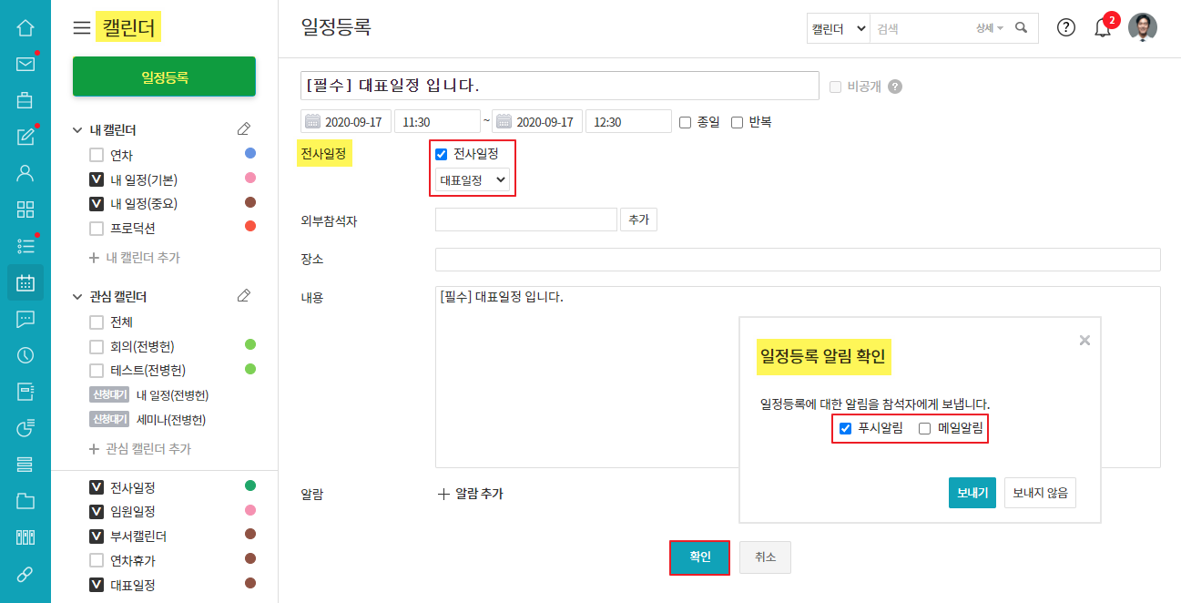 전사일정 체크 ▷ 캘린더 선택 ▷ 확인 ▷ 일정등록 알림 확인 푸시알림/메일알림 체크 ▷ 보내기