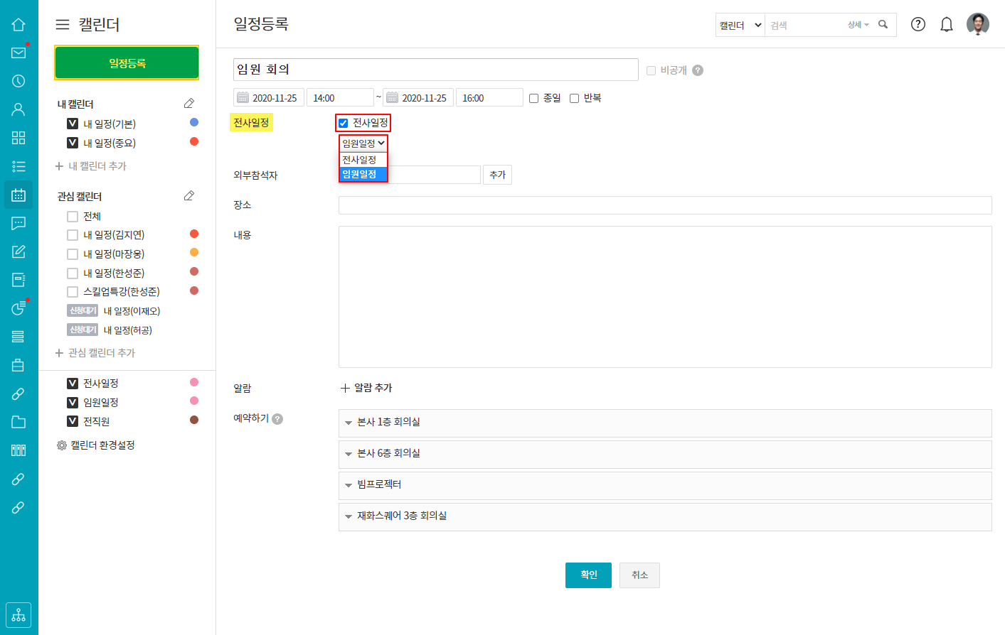 일정 등록 클릭 후 전사 일정에 체크하여 원하는 전사 캘린더를 선택 후 등록하시기 바랍니다.