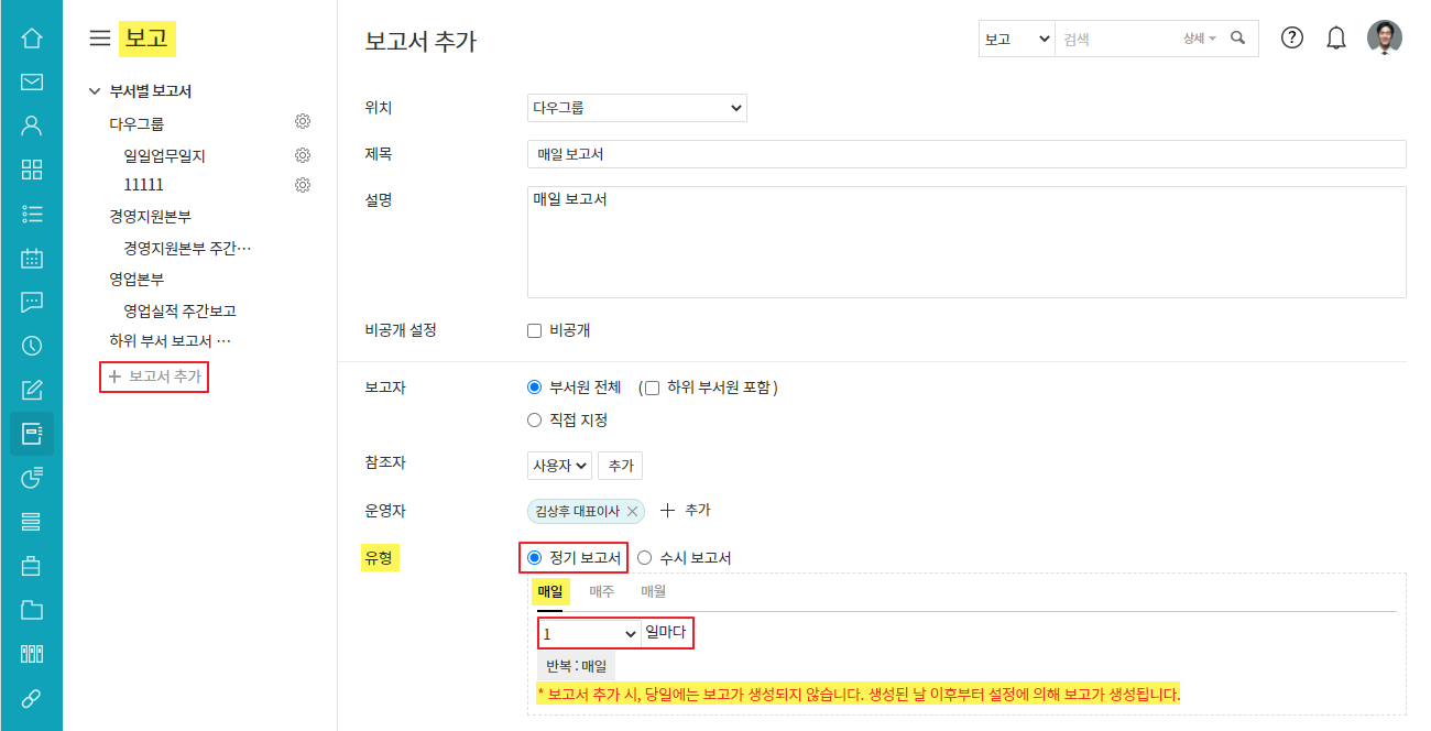 보고서 추가 시 [유형]에서 정기 보고서 ▷ 매일 ▷ 1일마다로 설정하여 매일 생성되는 보고서를 추가할 수 있습니다.
