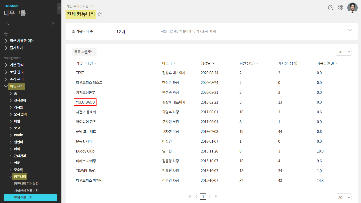 ① 관리자페이지(SiteAdmin) ▶ 메뉴 관리 ▶ 커뮤니티 ▶ 전체 커뮤니티 ▶ 커뮤니티 선택
