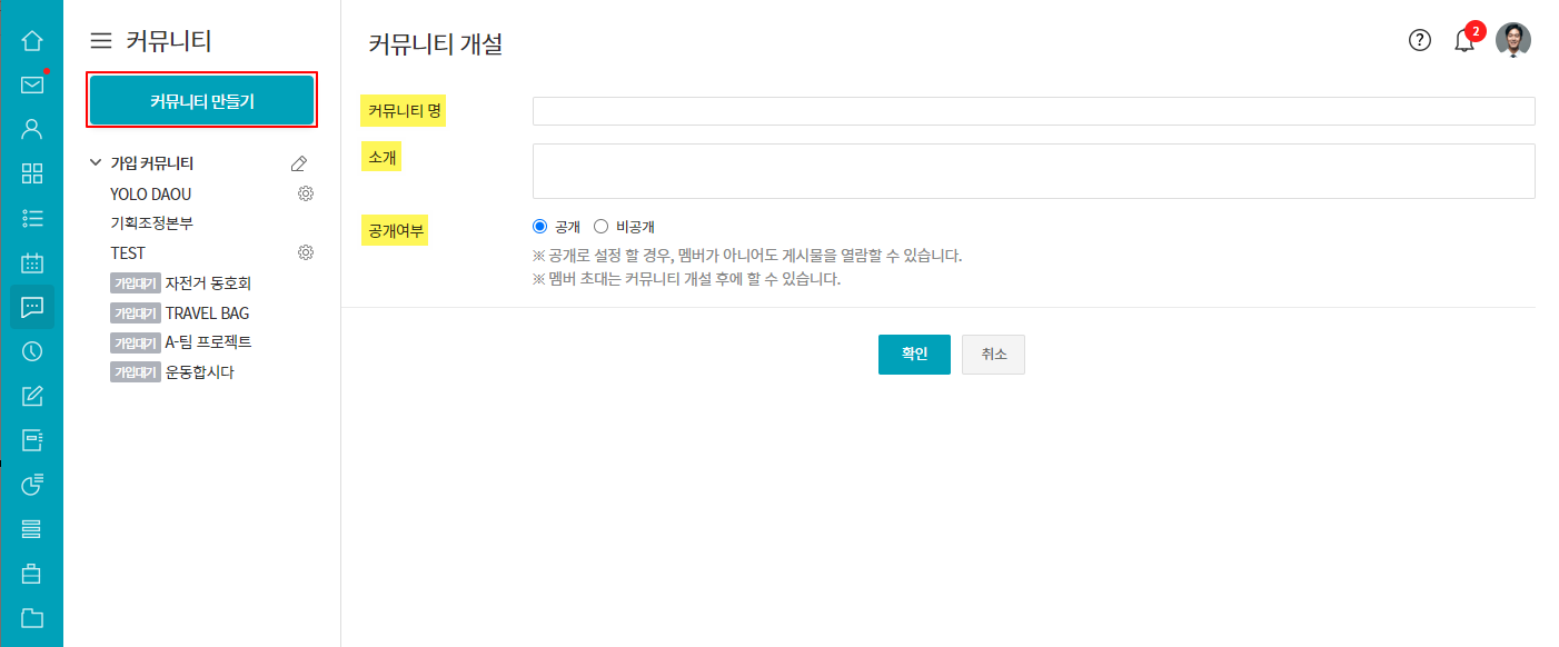 단, 생성된 커뮤니티는 관리자의 설정에 따라 자동으로 혹은 관리자의 승인을 얻은 후에 활성화 됩니다.