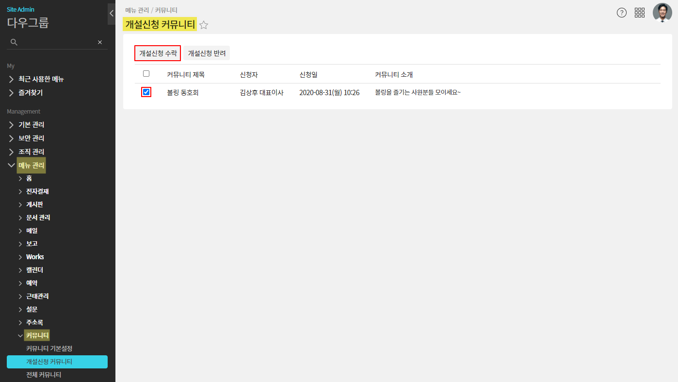 ※ 커뮤니티 개설방식이 '관리자 승인 후 개설'로 설정되어 있을 때 승인 방법입니다.