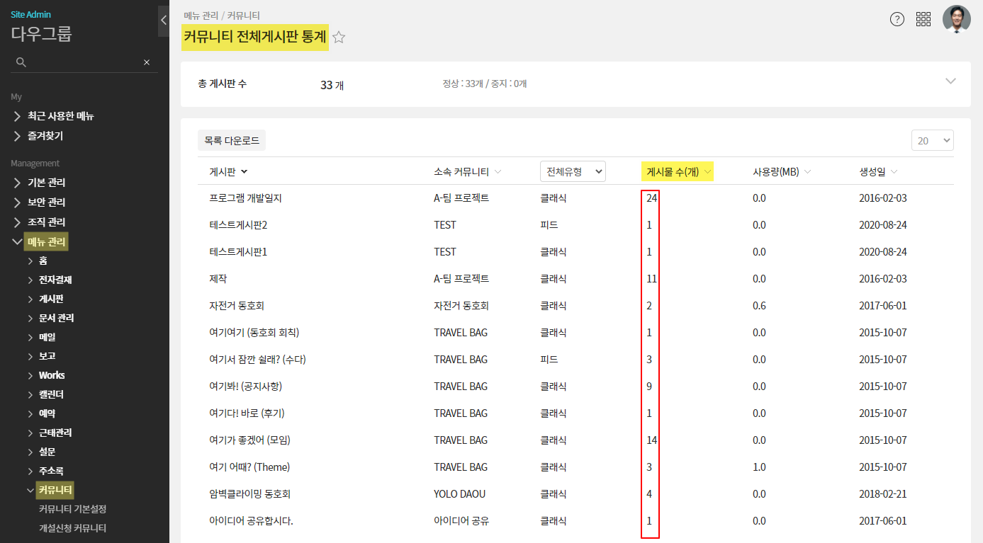 - 관리자페이지(SiteAdmin) ▶ 메뉴 관리 ▶ 커뮤니티 ▶ 커뮤니티 전체 게시판 통계 ▷ 게시판 별 게시물 수 확인