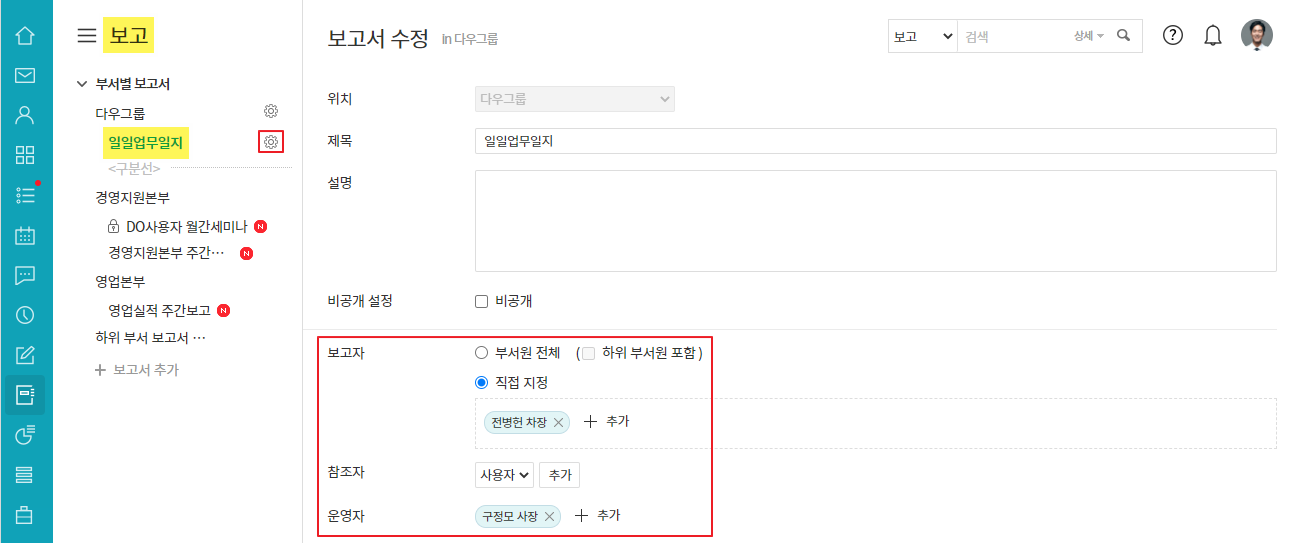 - 보고 ▶ 보고서 옆 톱니바퀴 ▶ 보고자/참조자/운영자에 사용자 추가 ▷ 저장