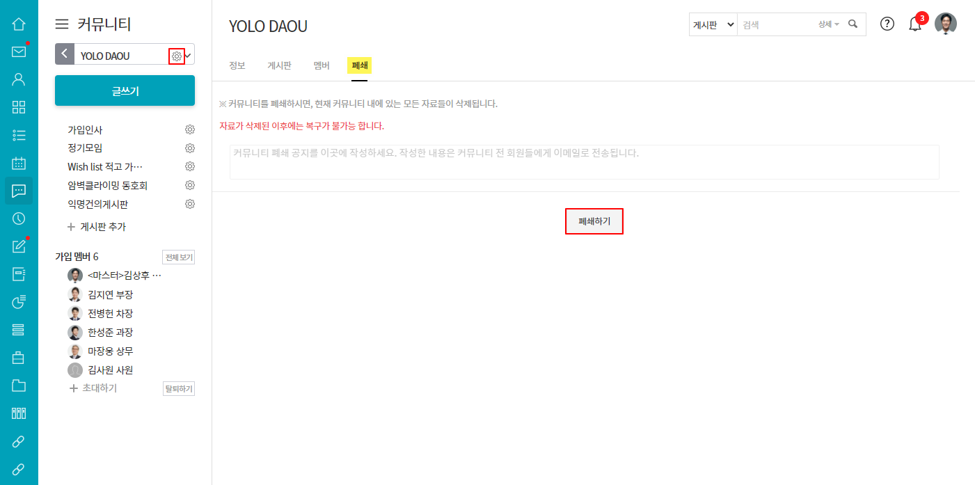 ※ 커뮤니티 폐쇄 시 커뮤니티 내 모든 자료들은 삭제되며 복구 불가합니다.