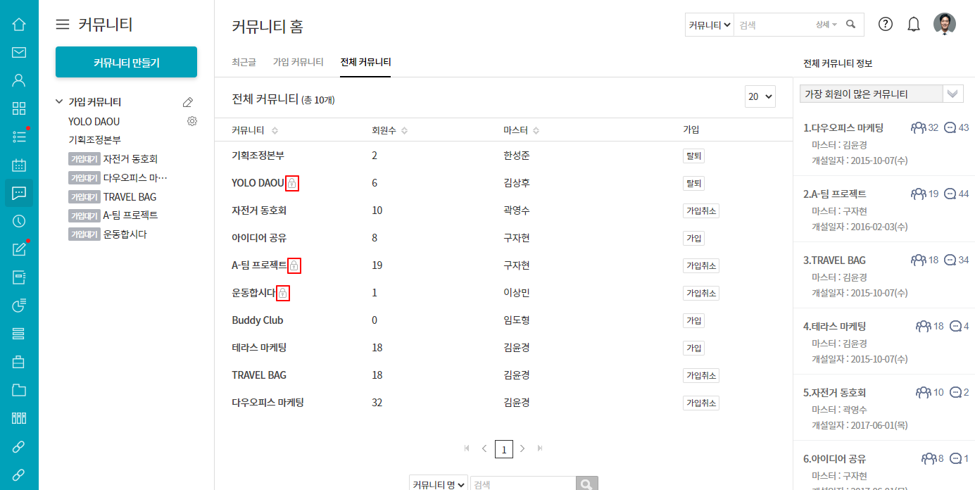 커뮤니티를 개설했으나 목록에서 보이지 않는 경우에는 관리자에게 승인 요청하시기 바랍니다.