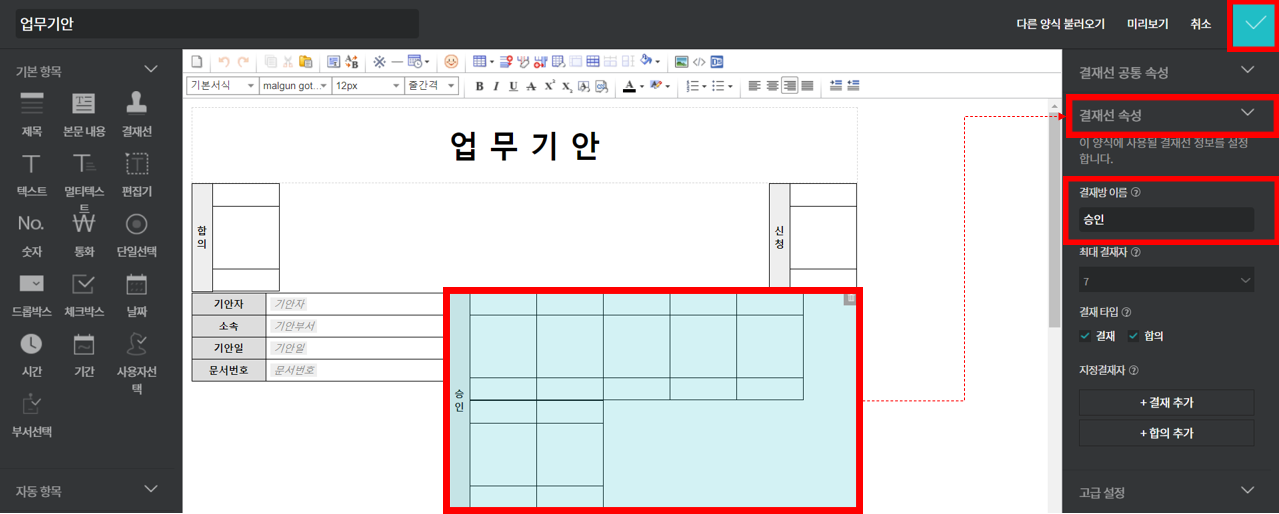 관리자 권한으로 양식 편집기에서 결재선 이름을 수정할 수 있습니다.