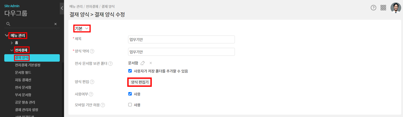 ① 관리자페이지 ▶ 메뉴관리 ▶ 전자결재 ▶ 결재 양식 ▶ 폴더 선택 ▷ 양식선택 ▷ 기본 ▷ 양식 편집기