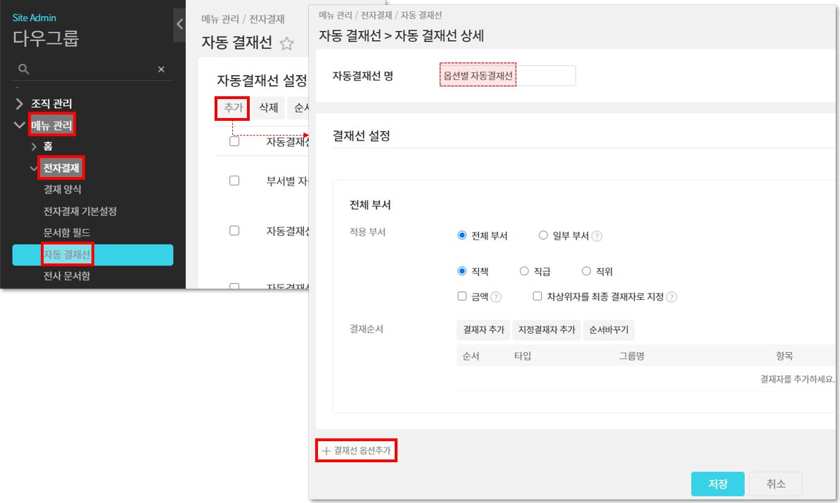 ① 관리자페이지 ▶ 메뉴 관리 ▶ 전자결재 ▶ 자동 결재선 ▶ 추가 ▷ 자동결재선 명 입력 ▷ + 결재선 옵션 추가