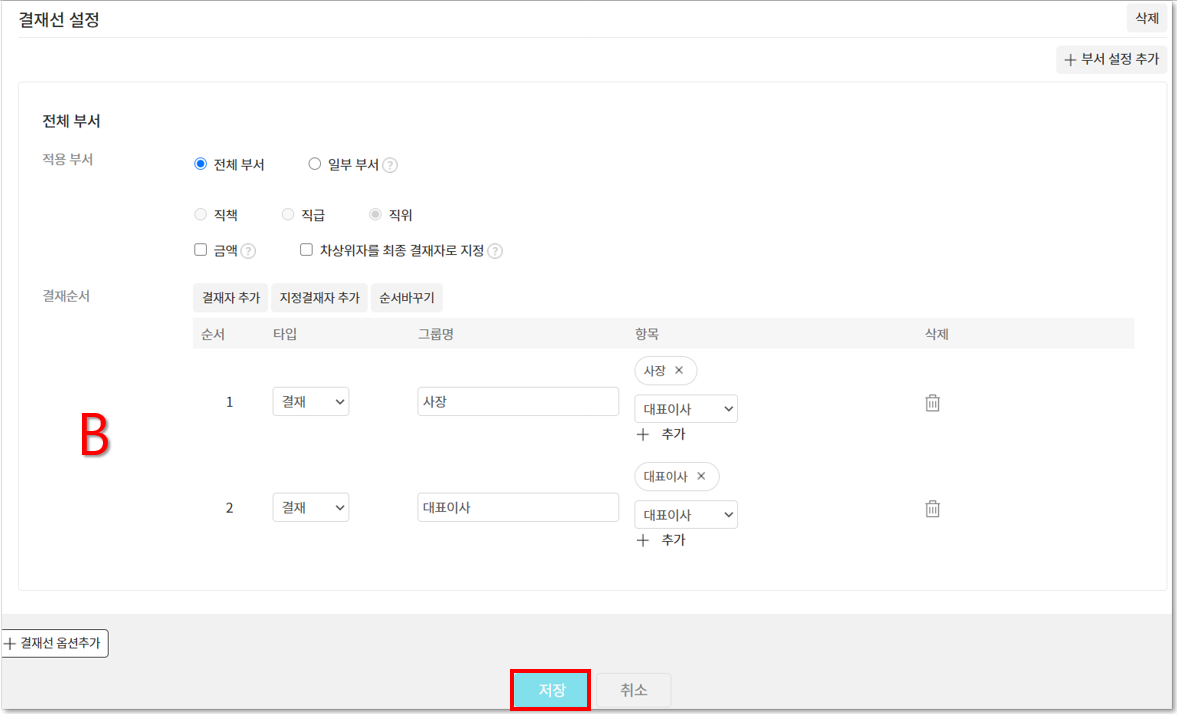 ② 원하는 수만큼 옵션추가 후 결재선 설정 ▷ 저장