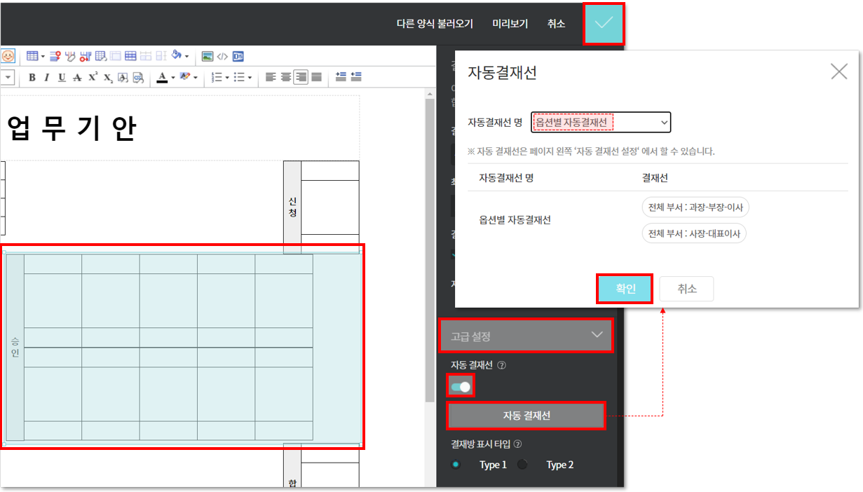 ④ 결재칸 클릭 ▷ 고급 설정 ▷ 자동 결재선 활성화 ▷ 자동 결재선 ▷ 자동결재선 선택 ▷ 확인