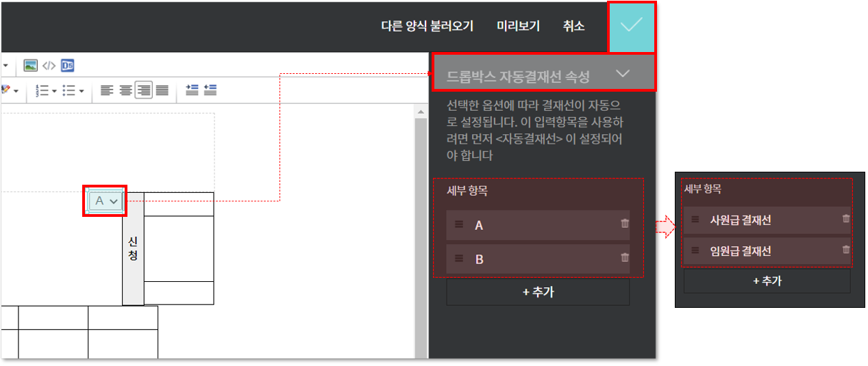 ※ 결재선 옵션추가로 자동 결재선 설정 시 양식 편집기에서 [드롭박스 자동 결재선]을 반드시 추가해야