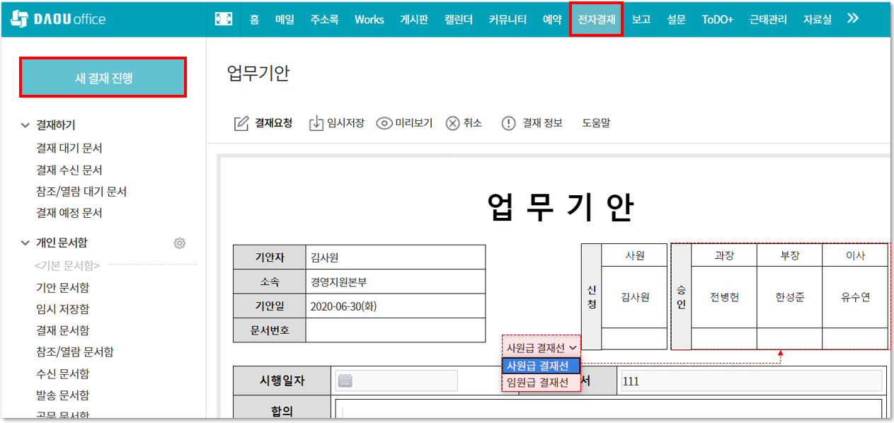 새 결재 진행 ▶ 양식 선택 ▷ 확인 ▷ 드롭박스 결재선 선택 ▷ 결재선 셋팅
