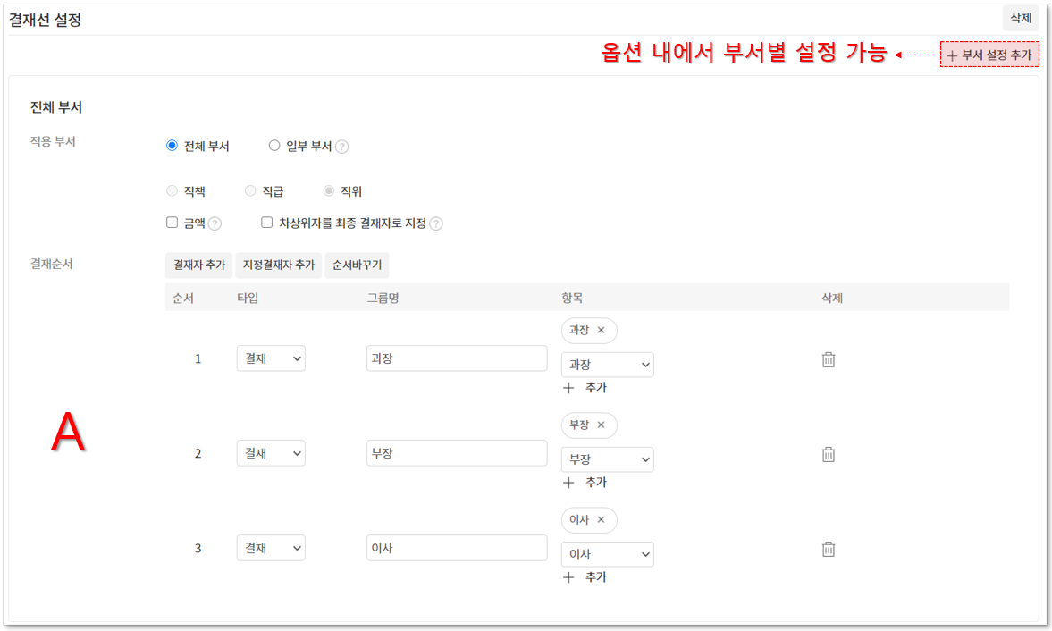 ② 자동 결재선에서 부서 설정 추가와 결재선 옵션 추가는 뭐가 다른건가요?