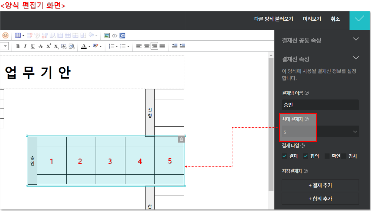 양식 편집기에서는 최대 결재자수(최대 : 10)를 설정하고, 설정한 수치로 결재칸을 표시하게 됩니다.