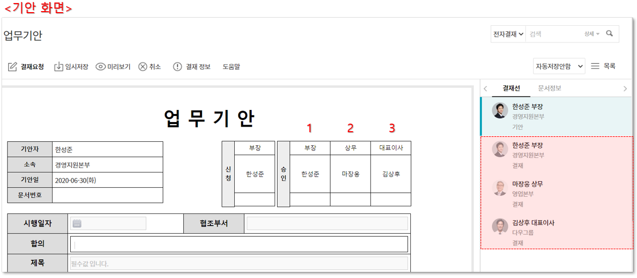 기안시에는 결재자로 지정한 만큼 표시됩니다.