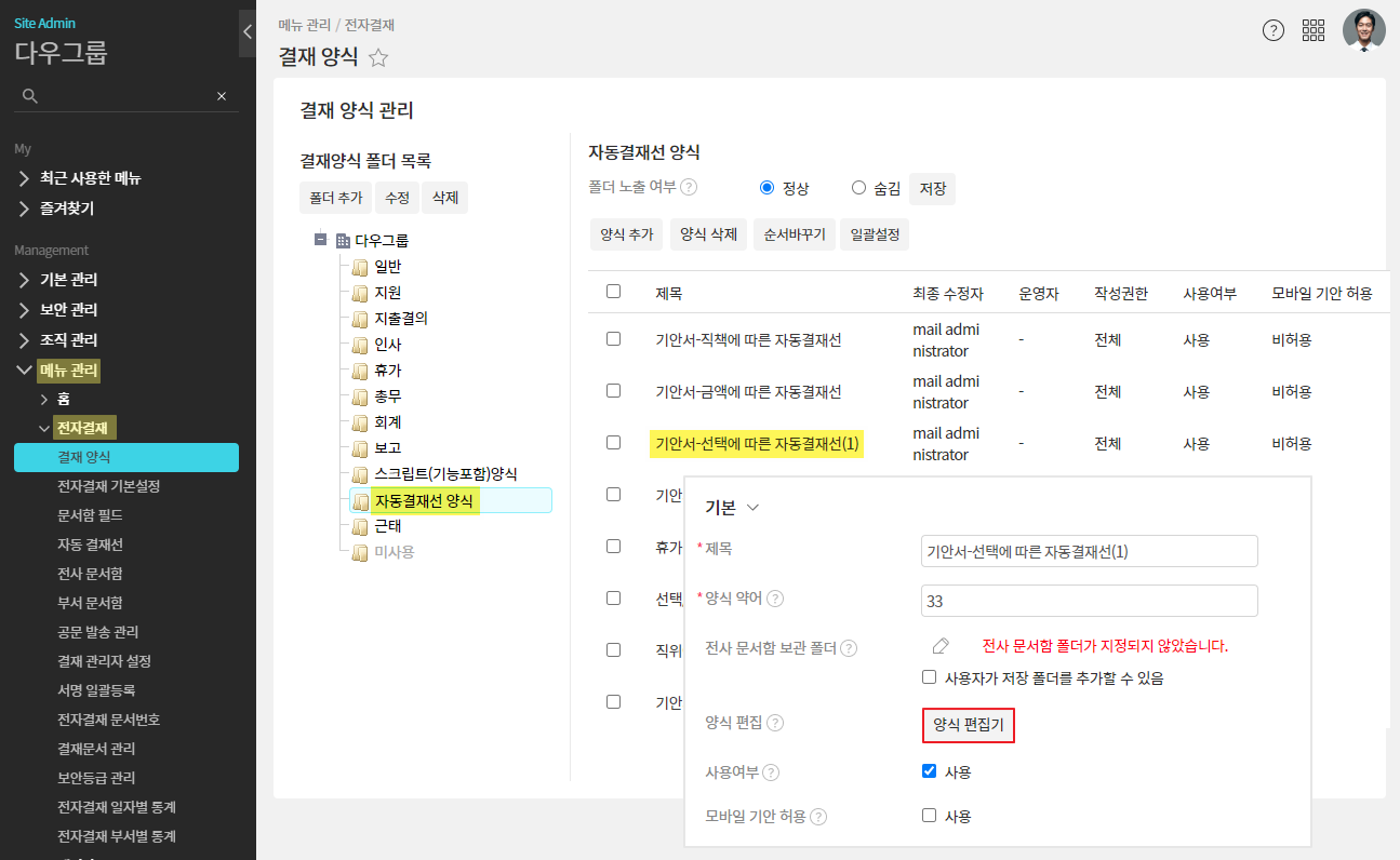 ③ 관리자페이지(SiteAdmin) ▶ 메뉴 관리 ▶ 전자결재 ▶ 결재양식 ▶ 폴더 및 양식 클릭 ▷ 양식편집기