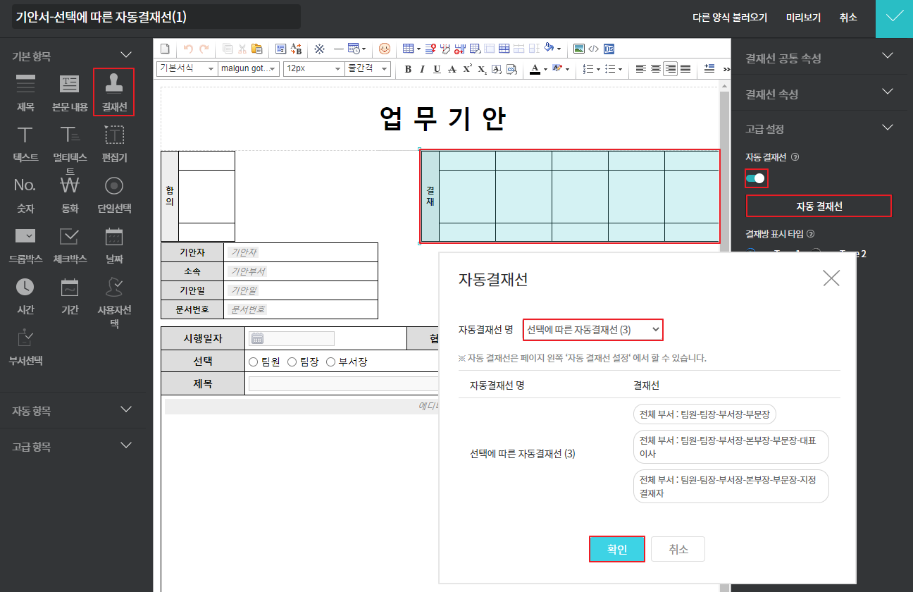 ⑤ 결재선 추가 및 클릭 ▷ 고급설정 ▷ 자동 결재선 활성화 ▷ 자동결재선