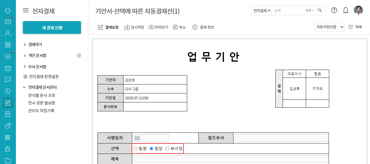 - [결재선 옵션추가]로 추가로 결재선은 기안자가 직접 선택해야 합니다.