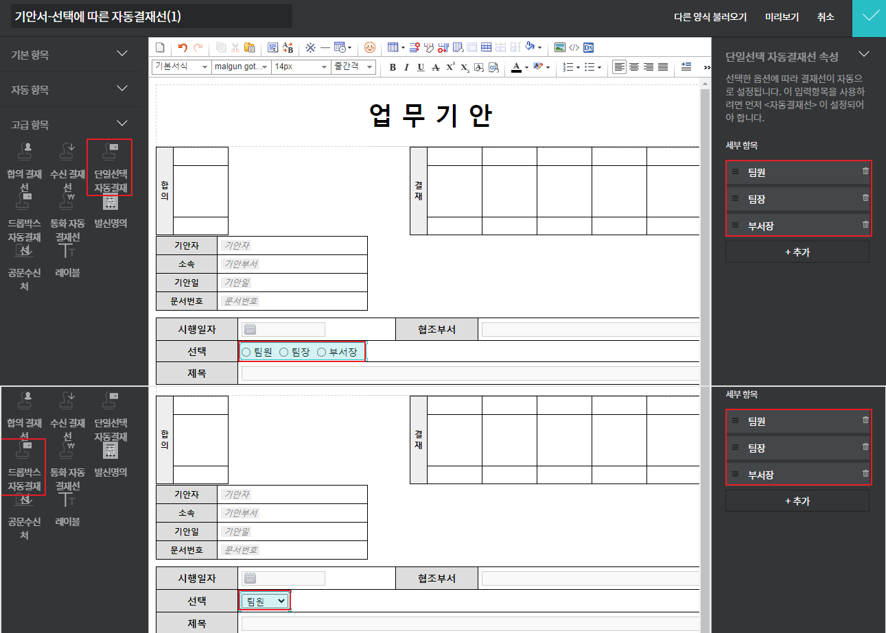 ④ 단일선택 자동결재선 or 드롭박스 자동결재선 추가 및 클릭 ▷ 세부항목 설정
