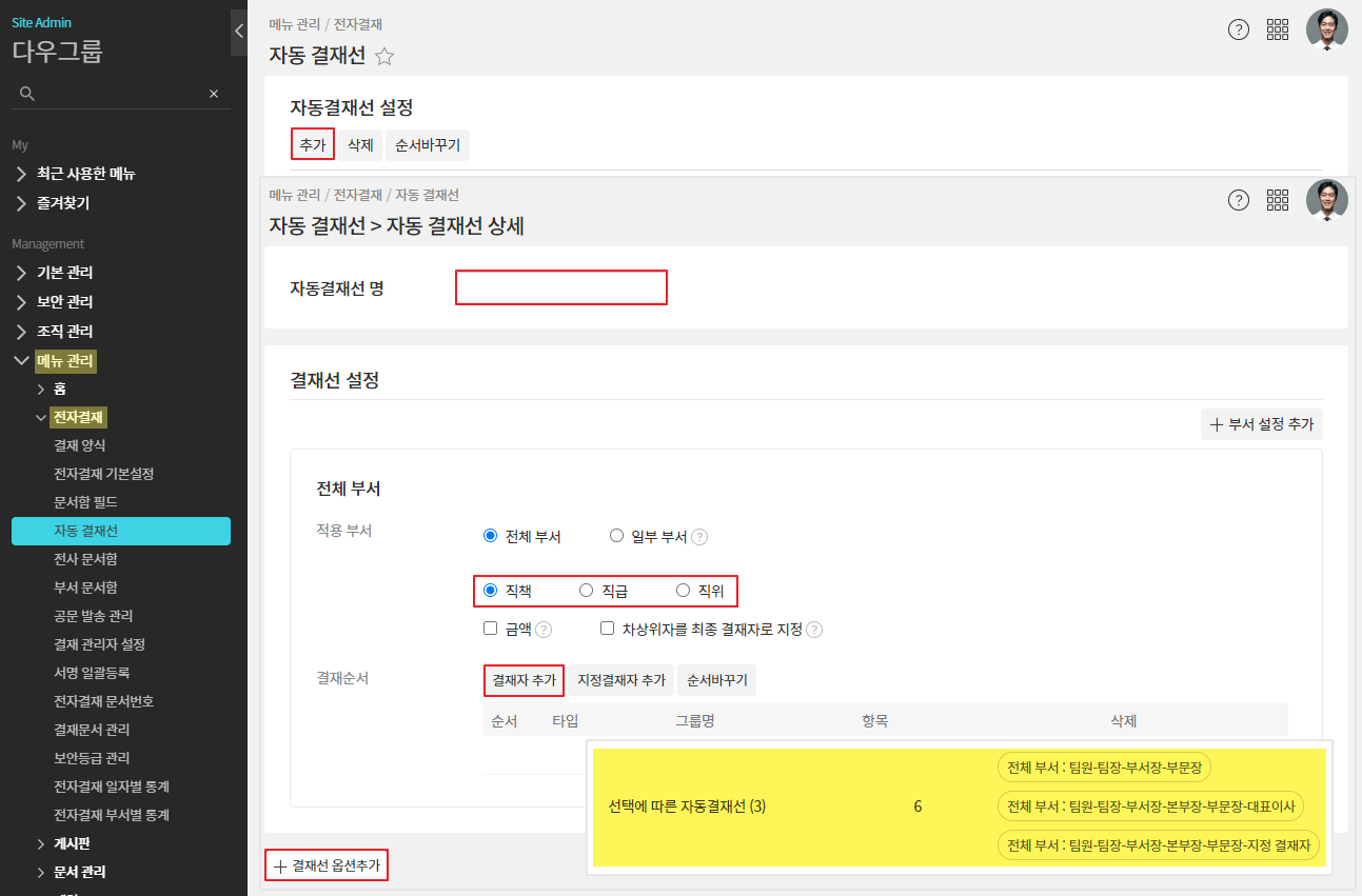 ① 관리자페이지(SiteAdmin) ▶ 메뉴 관리 ▶ 전자결재 ▶ 자동 결재선 ▶ 추가