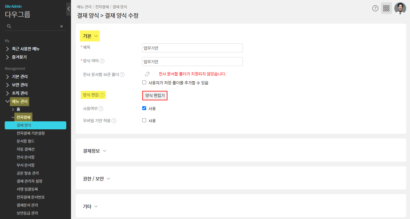 ① 관리자페이지(SiteAdmin) ▶ 메뉴 관리 ▶ 전자결재 ▶ 결재 양식 ▶ 폴더 선택 ▷ 양식 선택 ▷ 기본 ▷ 양식 편집
