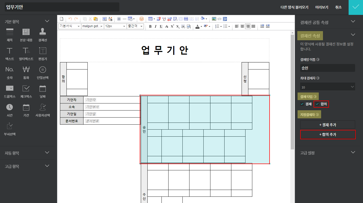 양식 편집기에서 합의자를 지정결재자로 설정할 수 있습니다.