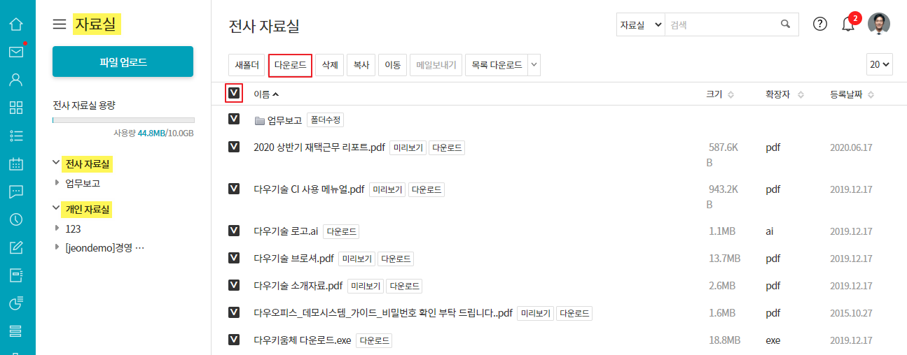 다운로드 기능을 통해 자료를 백업할 수 있습니다.