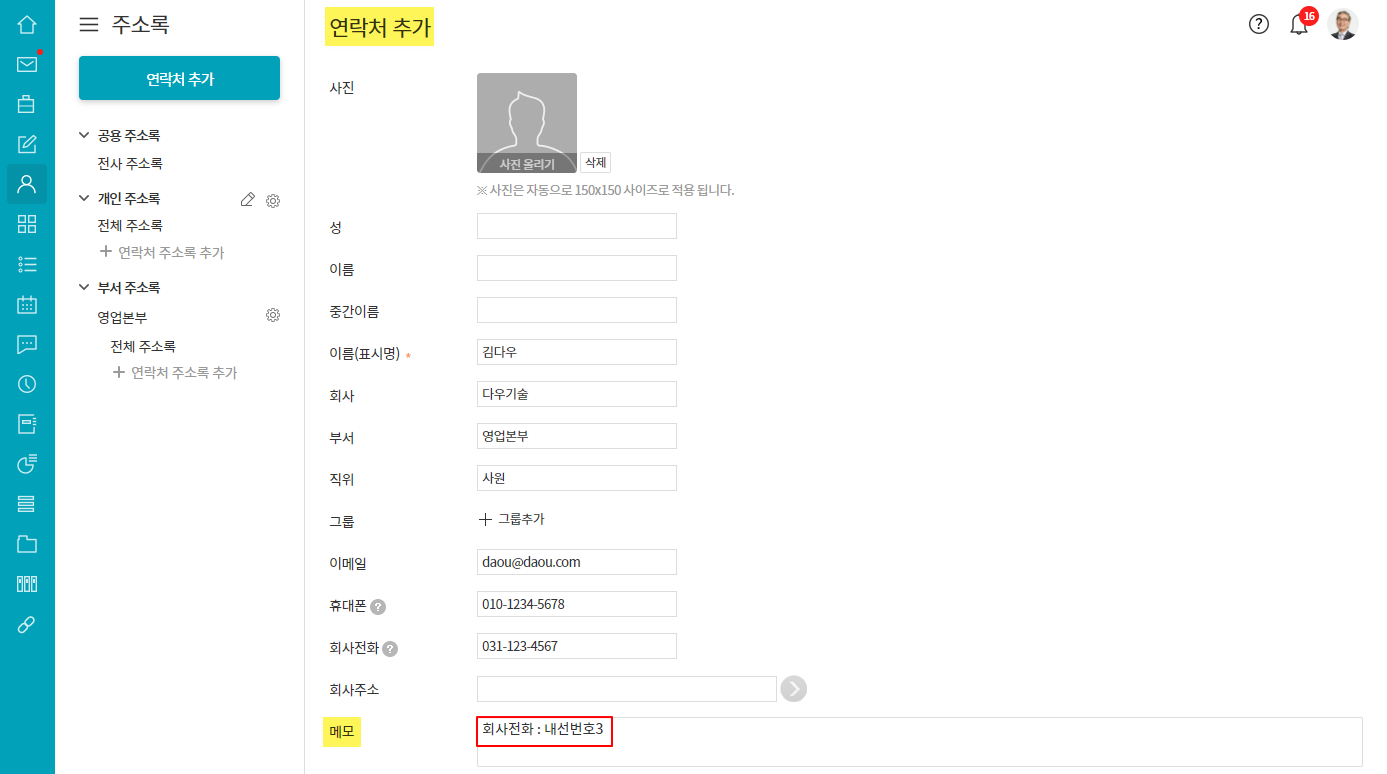 ■ 요약전화번호 입력란에는 -, +, 0~9까지의 숫자 이외에는 입력할 수 없습니다.내선번호의 경우 메모란에 따로 기입하시기 바랍니다.