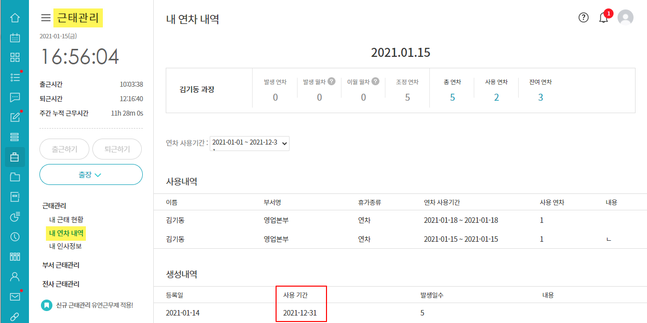 - 근태관리 ▶ 내 연차 내역 ▶ 생성내역 ▷ 사용 기간