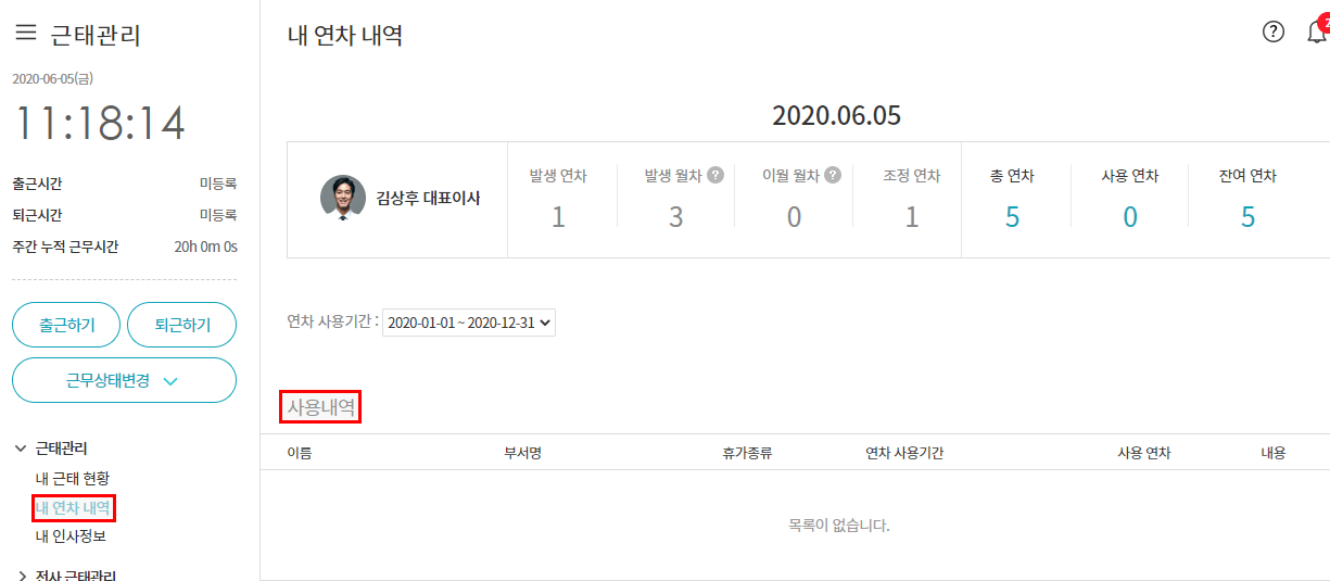 - 근태관리 ▶ 내 연차 내역 ▷ 사용내역 확인