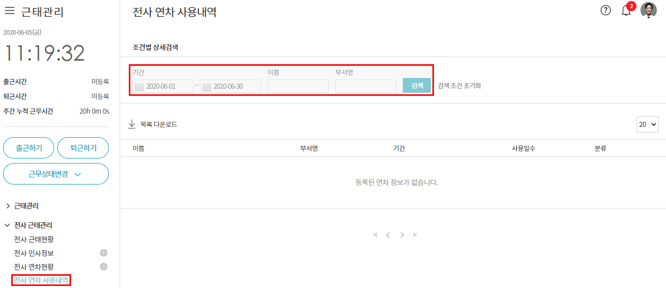 - 근태관리 ▶ 전사 연차 사용내역 ▷ 기간/이름/부서별로 검색 ▷ 내역 확인