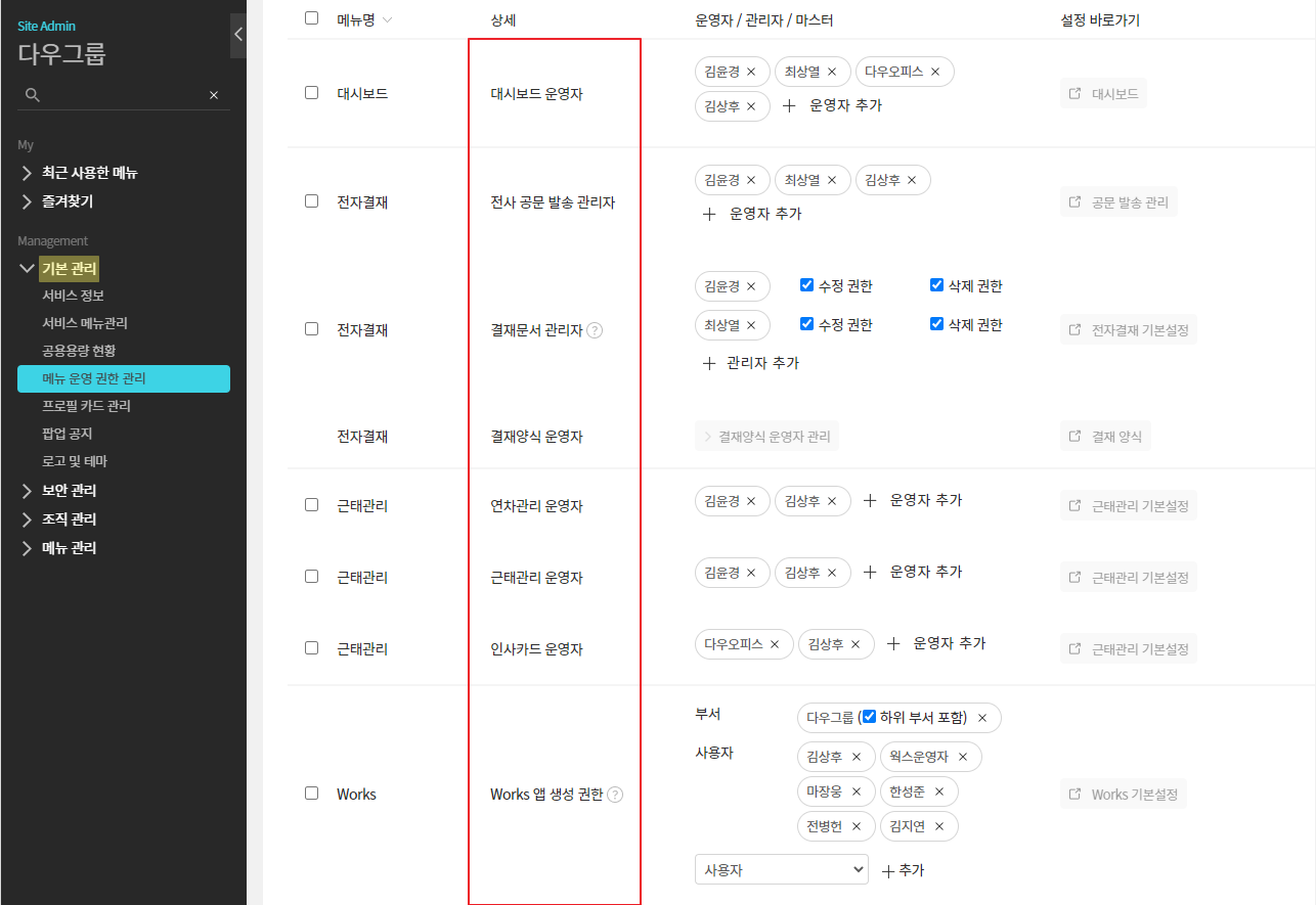 - 추가할 수 없습니다. 각각 메뉴에 대해 운영자 권한을 부여야하여야 합니다.