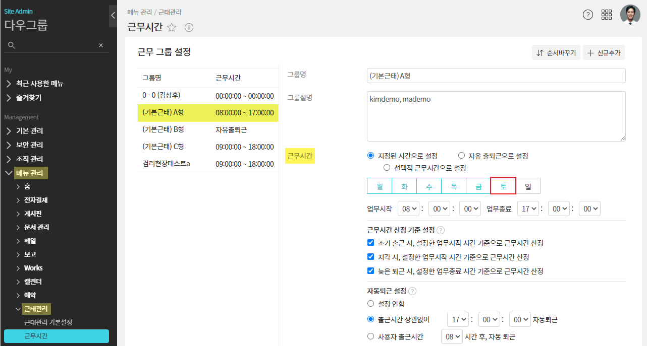 관리자 권한으로 근무그룹 설정을 변경할 수 있습니다.