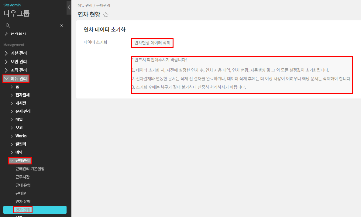 - 관리자페이지(SiteAdmin) ▶ 메뉴관리 ▶ 근태관리 ▶ 연차 현황 ▷ 연차현황 데이터 삭제 클릭