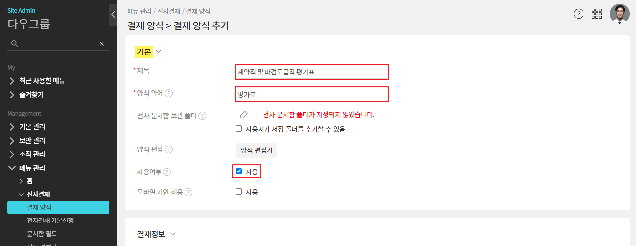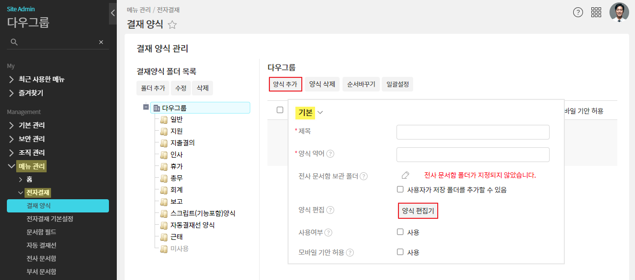 ① 관리자페이지(SiteAdmin) ▶ 메뉴 관리 ▶ 전자결재 ▶ 양식 추가 ▷ 양식편집기