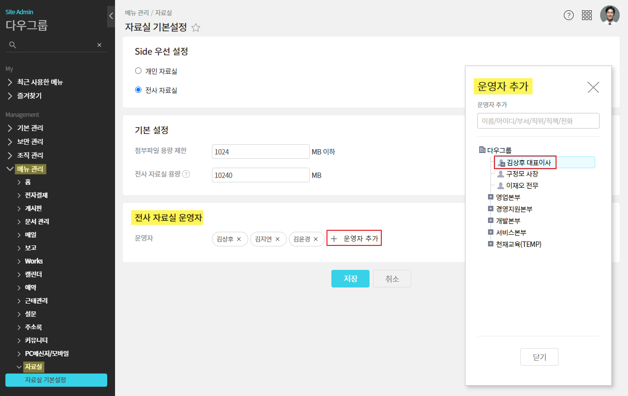 관리자 권한으로 전사 자료실 운영자를 설정할 수 있습니다.
