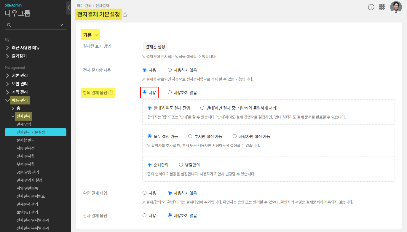 <합의 결재 옵션 사용 설정 방법>