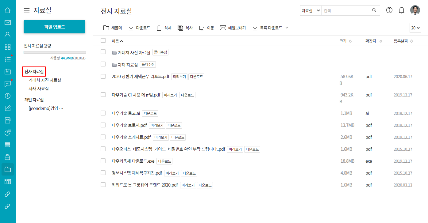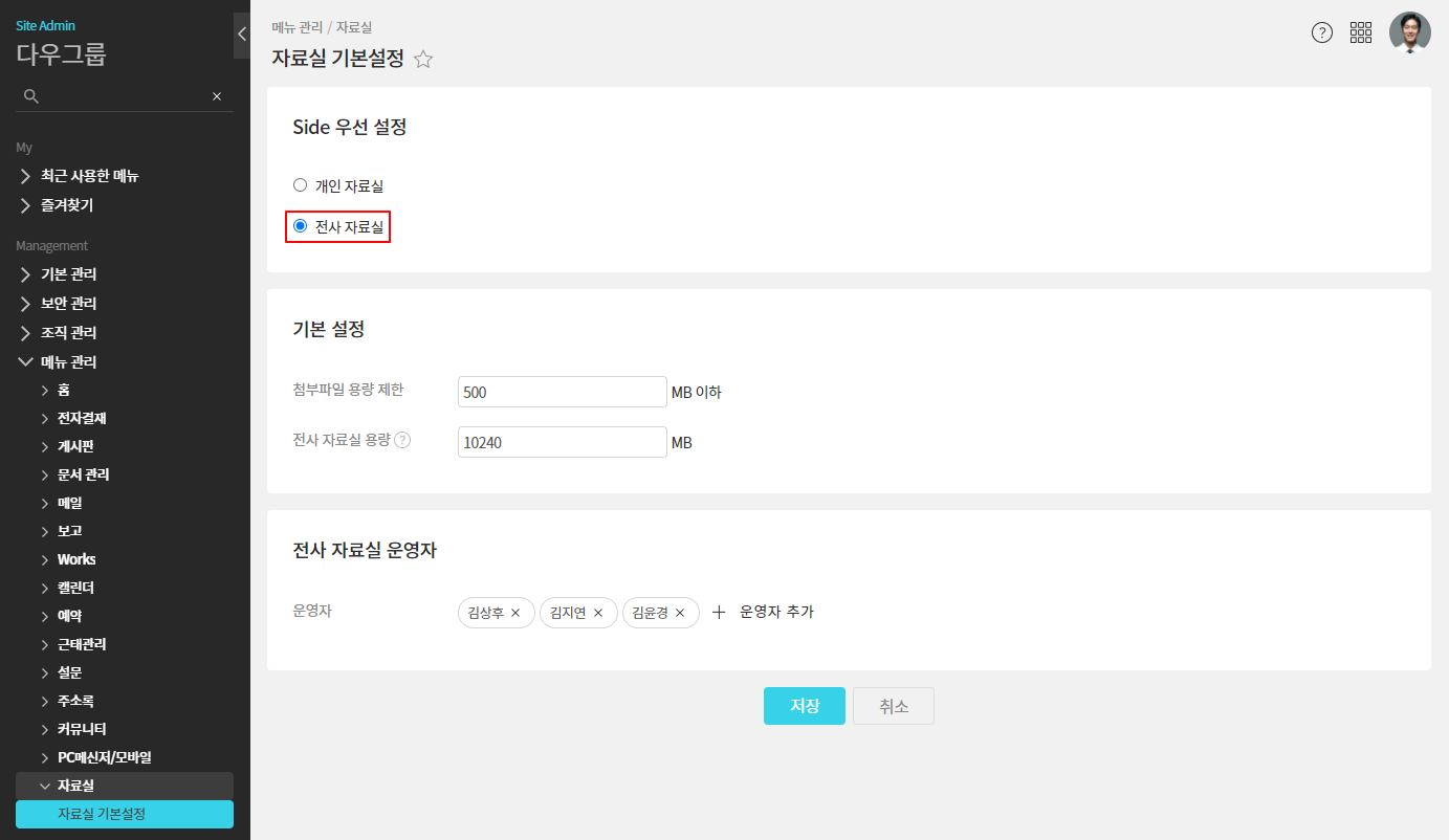 ■ 요약자료실 좌측 메뉴바에서 개인 자료실과 전사 자료실 중 먼저 보여질 항목을 선택하는 기능입니다.