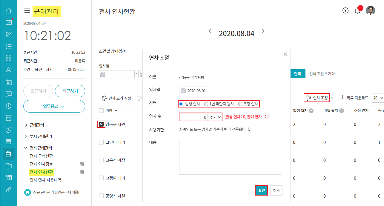 - 근태관리 ▶ 전사 연차현황 ▶ 사용자 체크 ▷ 연차 조정 클릭 ▷ 종류 선택 ▷ 연차 수 입력 ▷ 추가/제외 선택 ▷ 확인