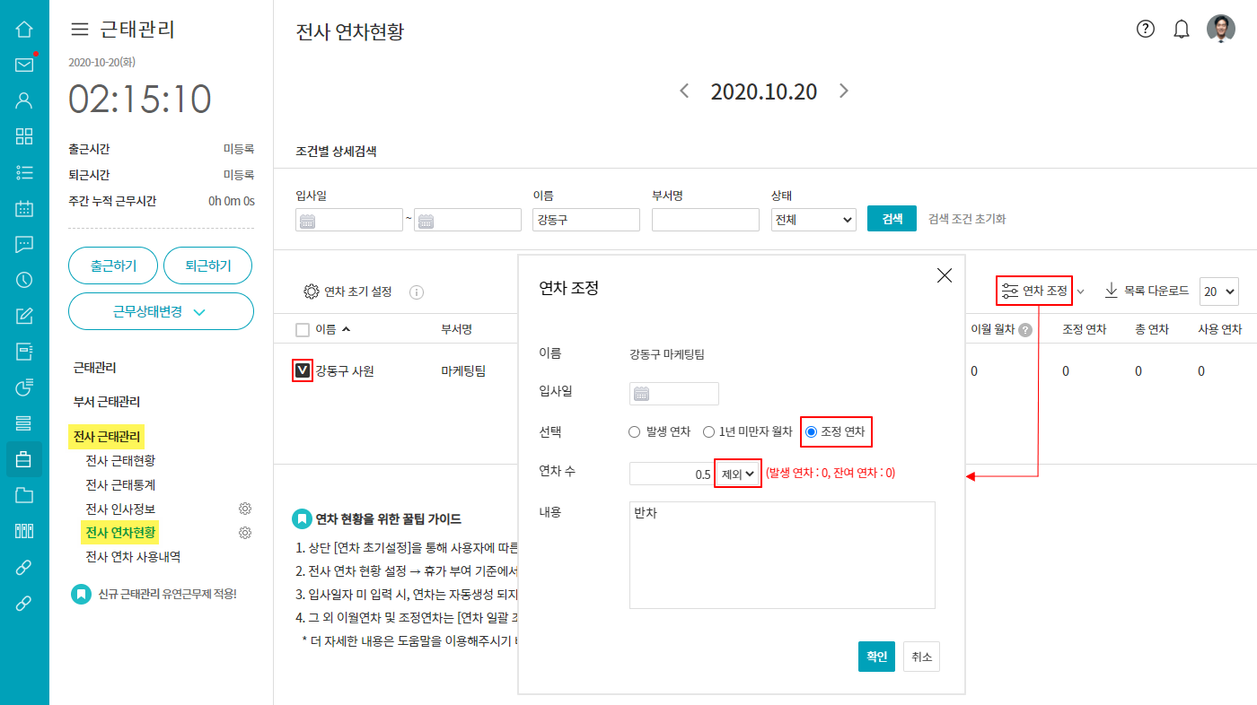 연차관리 운영자가 전사 연차현황에서 연차를 차감시킬 수 있습니다.