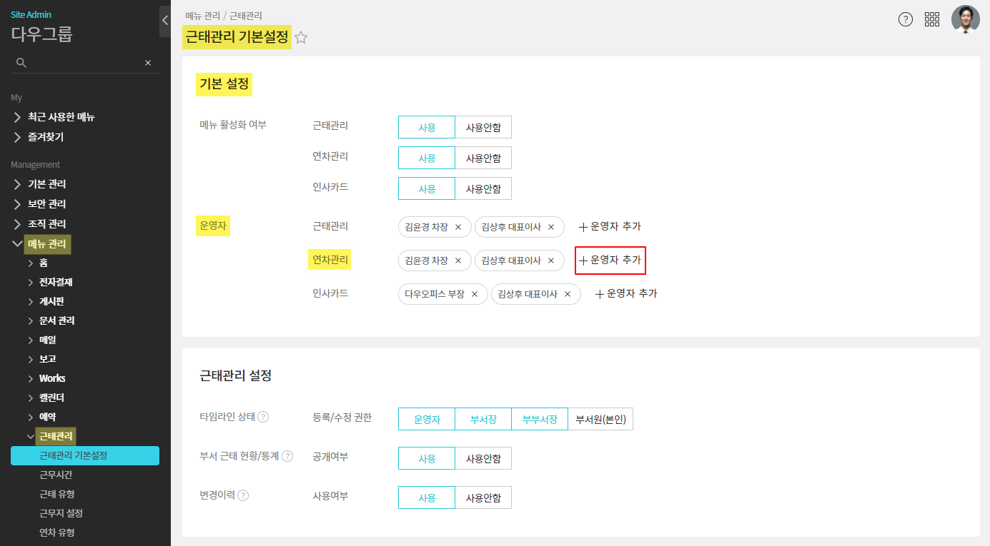 - 관리자페이지(SiteAdmin) ▶ 메뉴 관리 ▶ 근태관리 ▶ 근태관리 기본설정 ▶ 기본 설정 ▷ 운영자 ▷ 연차관리 ▷