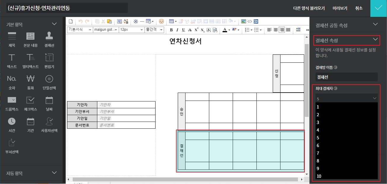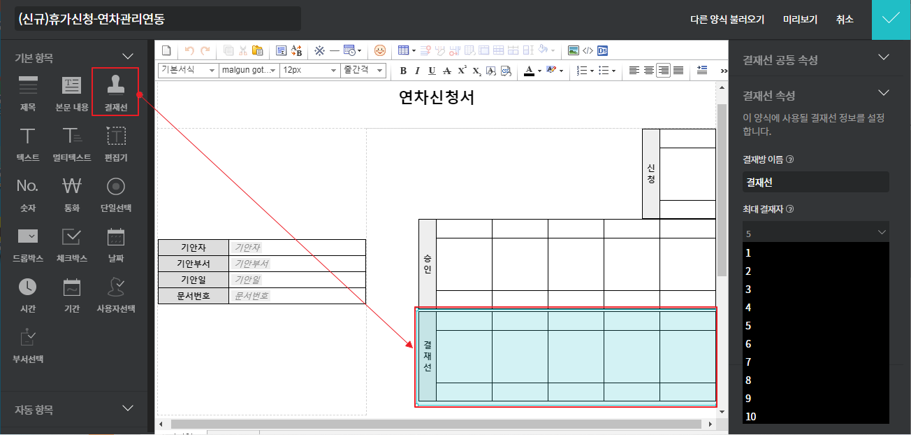양식편집기를 통해 결재선 추가 또는 결재칸 수를 변경할 수 있습니다.