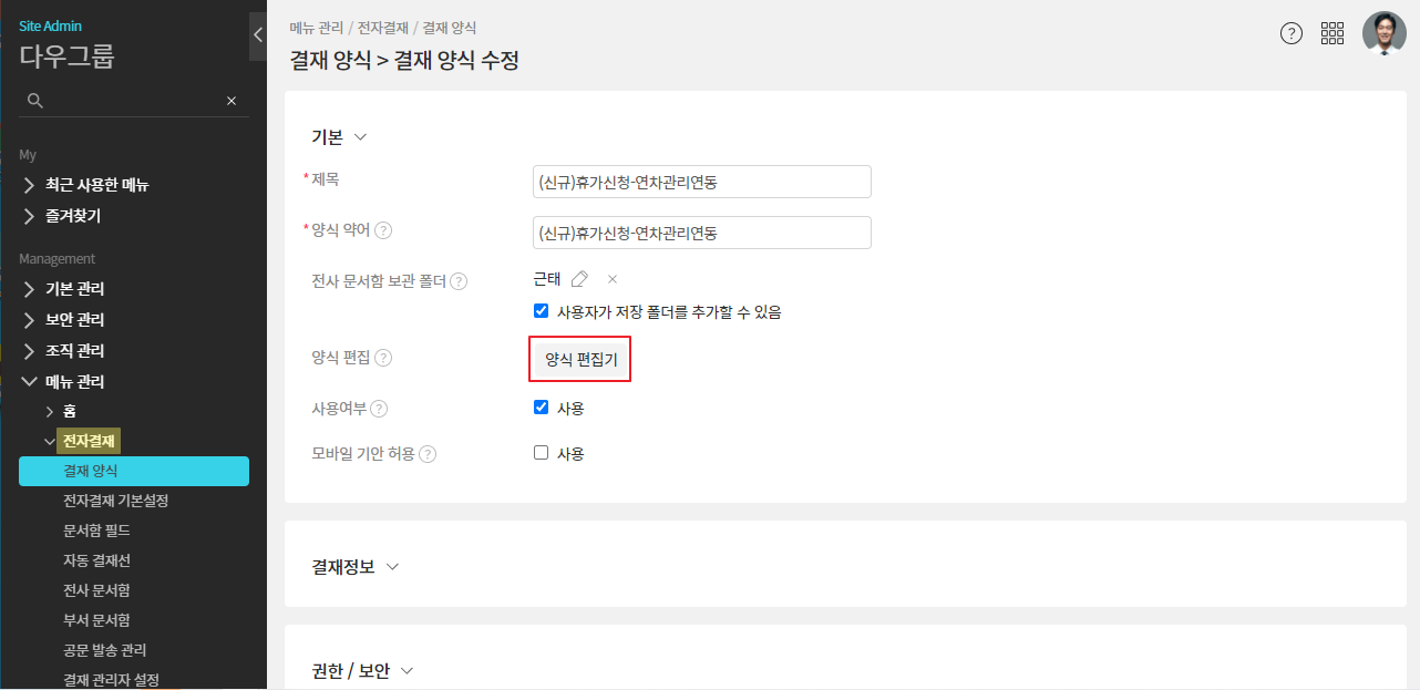 ① 관리자페이지 ▶ 메뉴관리 ▶ 전자결재 ▶ 결재 양식 ▶ 휴가신청서 양식 제목 클릭 ▷ 양식 편집기