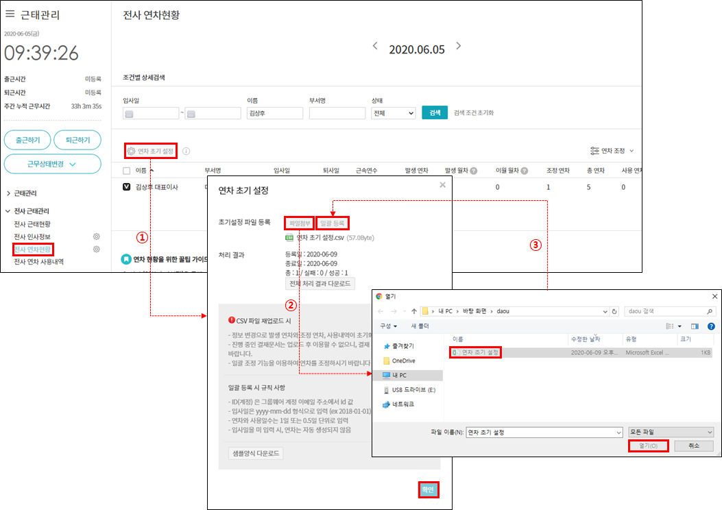④ 근태관리 ▶ 전사 연차현황 ▶ 연차 초기설정 ▷ 파일첨부 ▷ 파일선택 ▷ 일괄등록 ▷ 확인
