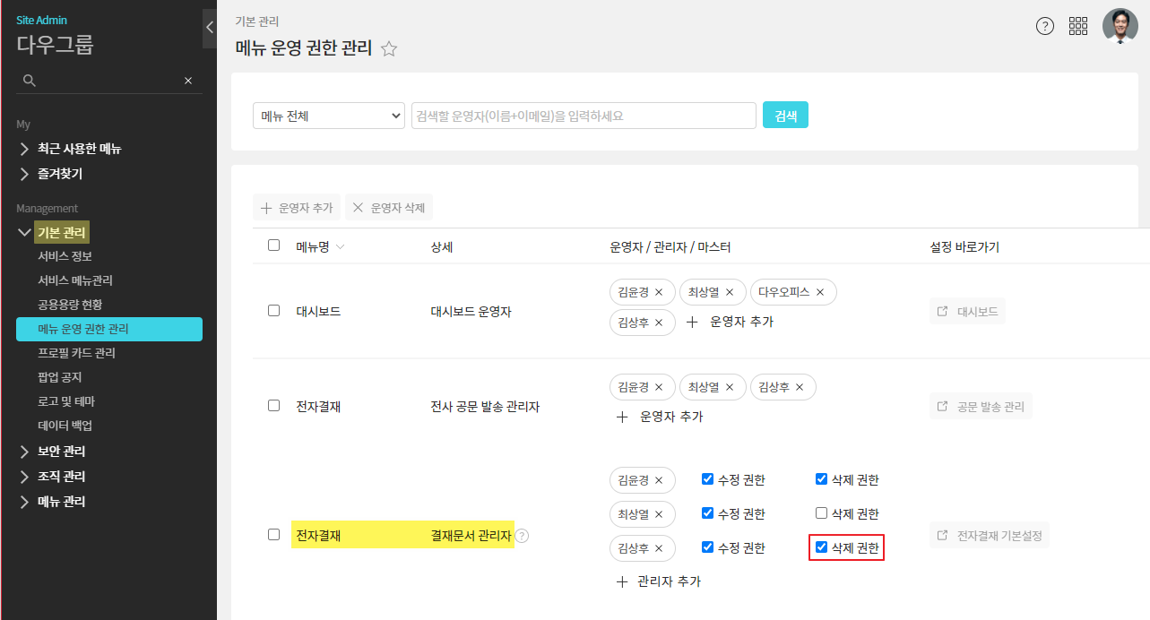 - 관리자페이지(SiteAdmin) ▶ 기본 관리 ▶ 메뉴 운영 권한 관리 ▶ 전자결재 결재문서 관리자 ▷ 삭제 권한 체크