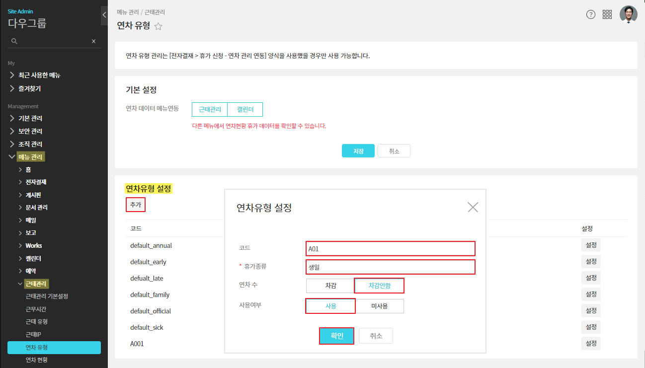 - 관리자페이지(SiteAdmin) ▶ 메뉴 관리 ▶ 근태관리 ▶ 연차 유형 ▶ 연차유형 설정 ▷ 추가 ▷