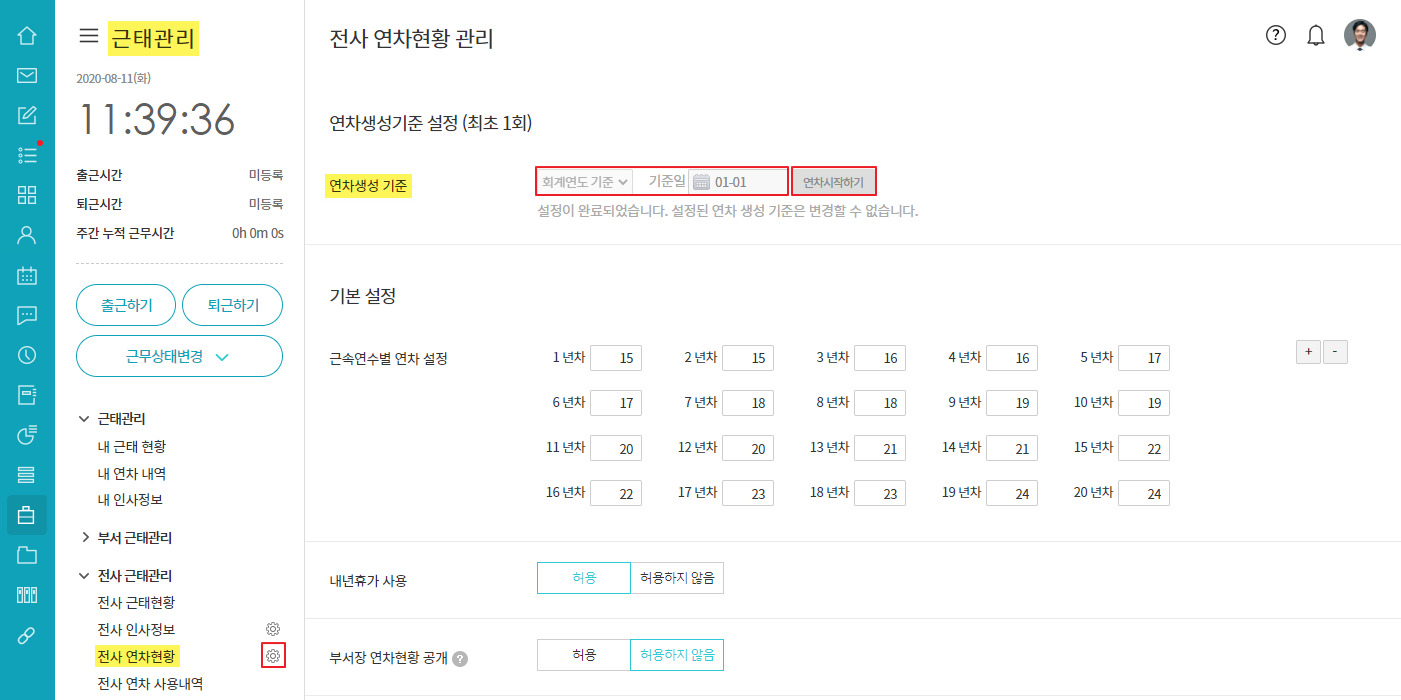 - 근태관리 ▶ 전사 연차현황 옆 톱니바퀴 ▶ 연차생성 기준 ▷ 기준 및 날짜 설정 ▷ 연차시작하기